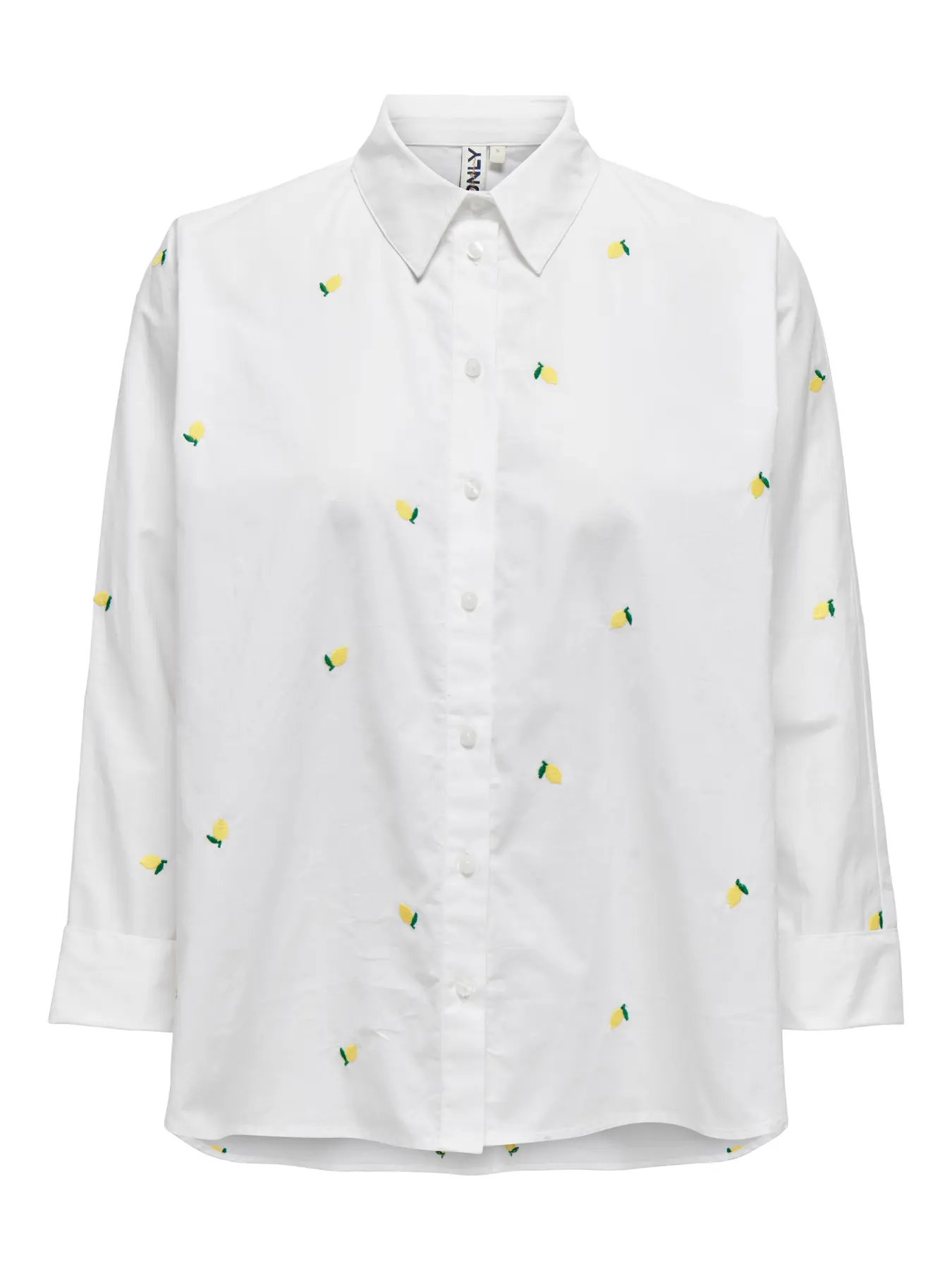 Whether paired with jeans for an effortless weekend look or tucked into tailored trousers or a midi skirt for a more elevated outfit, this lemon embroidered shirt is incredibly versatile. Its soft white base makes it the perfect match for both bold colors and neutral tones, adapting beautifully to a range of styles and occasions.